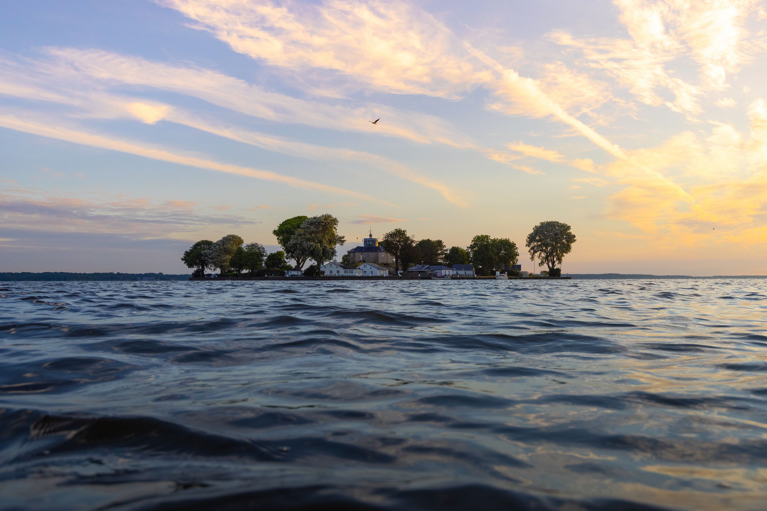 Højt oppe på himlen kredser en havørn, tæt ved jorden svæver sommerfugle og guldsmede. I og på vandet tumler badegæster og surfere, mens sejlbåde glider forbi.